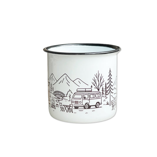 Emaille Tasse Camping – 380ml Outdoor Becher im Retro-Look mit Camper Motiv | Leicht & Robust | Ideales Geschenk für Natur- & Campingfans
